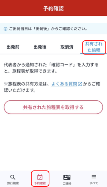 ①JTBアプリを開き、「予約確認」を押下し、右上の「共有された旅程」タブを選択してください。