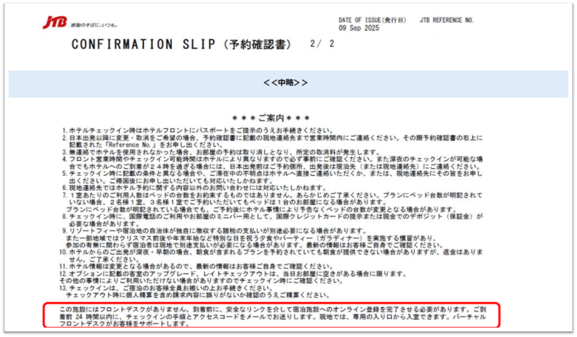 ・ホテル予約確認書の最終ページ、最下部をご確認ください。