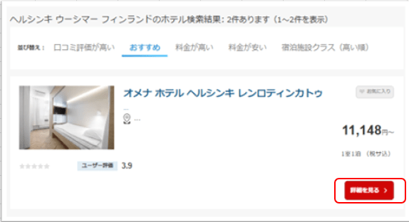 ①ホテル検索結果画面より、「詳細を見る」を押下してください。