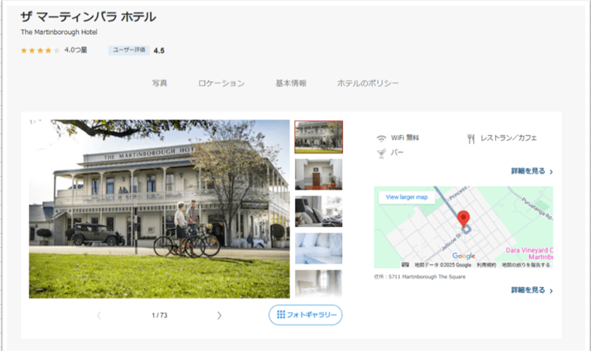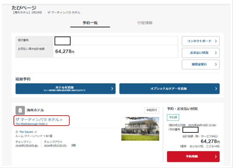 ホテル詳細画面は、たびページ「予約一覧」からホテル名を押下いただくとご確認いただけます。