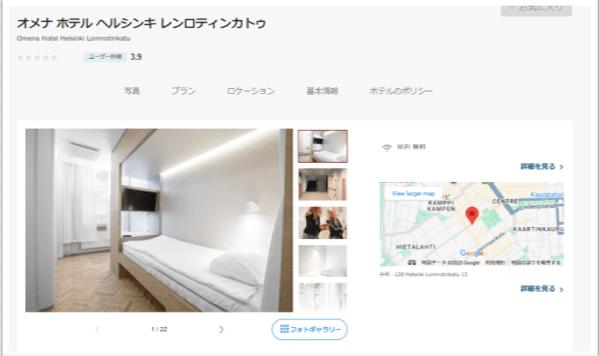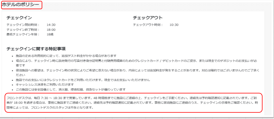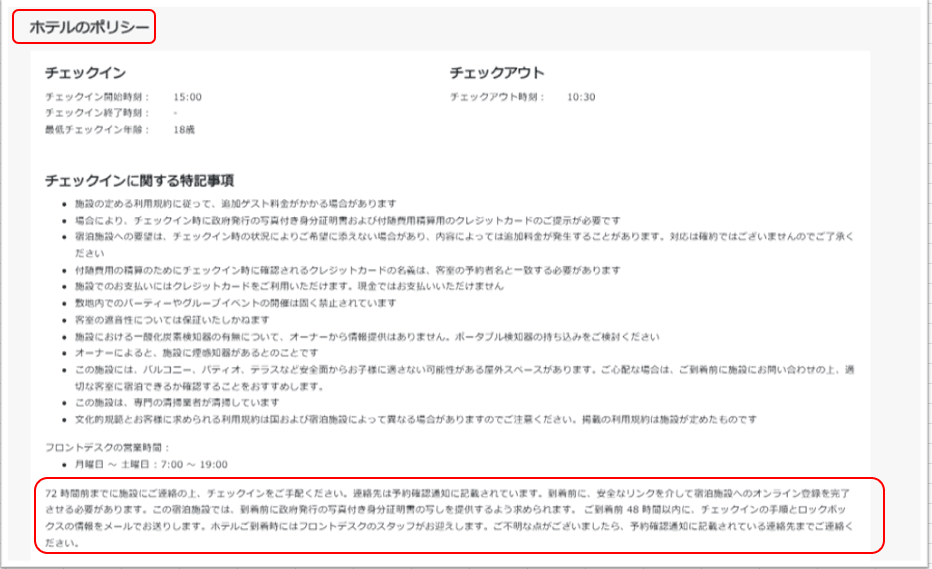 ②ホテル情報の中にある「ホテルポリシー」の最下部の記載情報をご確認ください。